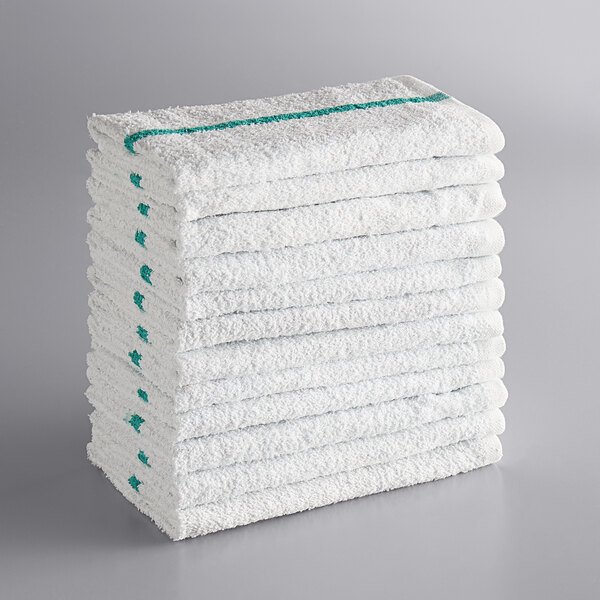 Keep your bar, kitchen, or other foodservice facility clean with this Choice 16″ x 19″ Green striped 32 oz. textured terry bar towel (300/case)